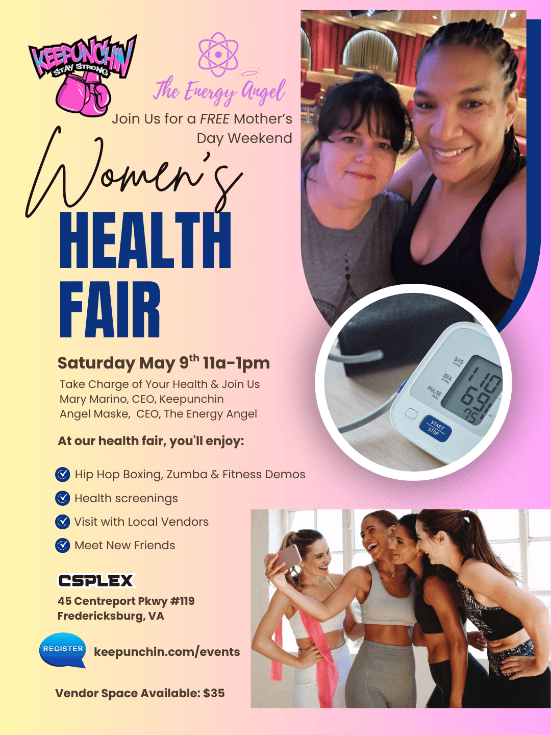 Join us for a special FREE Women’s Health Fair this Mother’s Day weekend and take charge of your well-being. This empowering event brings together fitness, health, and community in one place. Enjoy engaging activities like Hip Hop Boxing, Zumba, and live fitness demos, along with essential health screenings and the chance to connect with local vendors. Meet inspiring women, make new friends, and spend a meaningful day focused on your health and happiness. Happening on Saturday, May 9th from 11 AM to 1 PM at CSPLEX, Fredericksburg, VA.